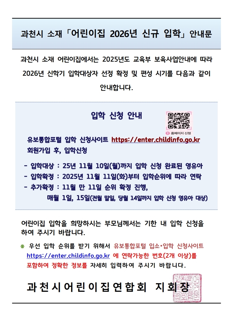과천시 소재 어린이집 2026년 신규 입학 안내
